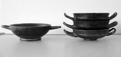 Les enchytrismes présentaient la particularité d’utiliser deux pithoi dont les bords se touchaient (fig. 1-2). Ils abritaient les dépouilles d’adultes en position allongée. Dans deux cas, le deuxième pithos était remplacé par une lekané ou par des pierres qui entouraient la partie inférieure du squelette. Seules quatre tombes contenaient du mobilier (fig. 3) : un skyphos de la première moitié du Ve s. av. J.-C., des coupes attiques de la seconde moitié du Ve s., des phiales à deux anses de la seconde moitié du Ve s. et une petite hydrie de la première moitié du IVe s. av. J.-C., enfin un vase en verre et une bague.