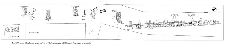 Rue Ermou (segment entre les rues Voutsika et Pittakou), on a découvert une partie du quai occidental du port de guerre au Sud de la ville antique. Le quai, conservé sur quatre assises d’élévation en appareil isodome d’une hauteur d’environ 1,30 m, présente une façade vers l’Est, alors que sa face occidentale est renforcée par des contreforts. Deux phases de construction peuvent être distinguées. L’assise supérieure est datée de l’époque romaine. Elle est constituée de blocs divers, certains en remploi, et scellés entre eux par un puissant mortier. Les trois assises inférieures sont constituées de boutisses et de carreaux liés par des crampons plats scellés au plomb et des goujons en bois. La forme des mortaises de l’assise inférieure nous donne une indication de datation pour la première phase, au Ve s. av. J.-C.