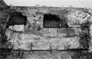À l’Est du quai, et à proximité de sa fondation, on a dégagé sept pieux de bois, qui servaient à renforcer le quai, dans l’environnement sableux du bassin du port. Du côté occidental du quai, en arrière de celui-ci, cinq murs parallèles, orientés Est-Ouest, ont été mis au jour, qui devaient rejoindre les contreforts du quai et sont liés à la phase romaine de construction du quai.