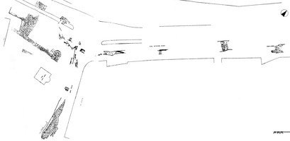 On a également fouillé l’extrémité semi-circulaire du quai Ouest de l’Euripe, qui est conservé sur une longueur de 28 m. Des pieux ont été employés pour renforcer les fondations du quai et de son extrémités construites en terrain sableux. Une jetée orientée Est-Ouest de 21 m de long et de 5,70 m de large a également été découverte. La partie occidentale de la jetée n’est conservée que sur assise d’élévation. On y observe un couloir dallé, parallèle à la jetée et bordé de tronc d’arbres pour en assurer sa stabilité. Ces installations datent de l’époque hellénistique et présentent des réparations romaines.