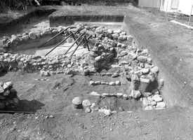 La fouille a livré la partie Sud d’un bâtiment rectangulaire de l’époque mycénienne, dont on distingue deux pièces.