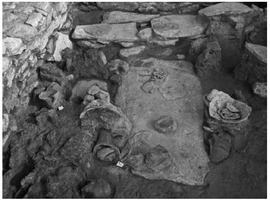 Par ailleurs, au Nord de la maison Z, on a partiellement fouillé une partie d’un bâtiment allongé à abside (bâtiment Θ), parallèle à la maison Z. À l’intérieur, on a trouvé une structure en pierre, délimitée par des petits murs parallèles en pierre qui formaient des couloirs étroits : il s’agit probablement d’un espace de stockage, d’après les fragments de pithoi qu’on y a retrouvés.