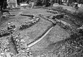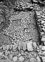 Sur le côté oriental du terrain, on a dégagé une niche semi-circulaire (diam. 4,80 m) et deux pièces rectangulaires (dim. 3 x 2,20 m et 2 x 0,30 m). Les murs (larg. 0,70 m ; haut. 0,50 m) sont construits en blocs de schiste et fragments de briques. Ces vestiges, identifiés au triclinium d’une villa romaine, sont datés du IIe s. apr. J.-C. Sous les fondations de la pièce Nord, on a dégagé un sol de galets qui constituait une partie de la cour d’un bâtiment plus ancien (fig. 3) – d’après la céramique, cet édifice date de l’époque hellénistique (IIe-Ier s. av. J.-C.).