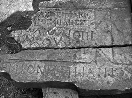 On a dégagé une partie d’une structure semi-circulaire constituée de deux assises, sur une longueur de 6,50 m environ, qui a pu servir comme base pour la presse qui a été découverte lors de recherches plus anciennes. Dans la partie Sud-Ouest de l’atelier, on a dégagé une presse orthogonale plus petite (fig. 1), des espaces de stockage pour les olives et de nombreuses cavités creusées dans la roche. À l’Est des pièces couvertes, on a mis au jour une cour avec un puits. Le mobilier compte des outils en pierre, des objets en bronze, des monnaies en bronze et de la céramique de l’époque romaine tardive, ainsi qu’un fragment inscrit d’un grand sarcophage en marbre (fig. 2).