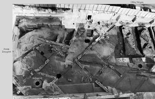 Roman to Late Roman periods: The area was once again used for burials. Two 1st B.C. – 1st A.D. pit graves were excavated. A large building was constructed in late 2nd – early 3rd c. A.D. The building consists of 16 rooms arranged around four large and two small courtyards. Its orientation is similar to that of the temple of Zeus and the Roman building identified as the gymnasium of Hadrian (2nd c. A.D.). The roof was built with Corinthian and Laconian roof tiles. Two cisterns were found under the building. The first was piriform in shape and the second rectangular. They were connected via a shaft. The piriform cistern was later converted into a well, which was in use until the 6th c. A.D. The rectangular one was partly filled with green clay and a two-step staircase was added to it. A choregic inscription for the Thargelia of 372/1 B.C. (Makri and Sakka, 2010-2013) was found in the piriform cistern. The purpose of the building remains unclear. It could have been a complex of shops or a guesthouse. In the 6th c. A.D. it was converted into a workshop complex. Circular pits, some of which filled with lime plaster, large quantities of pottery, slags, pieces of glass and marble fragments attest to this latter use.
