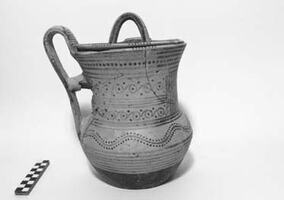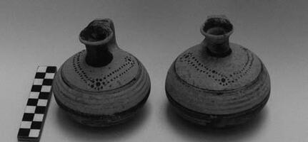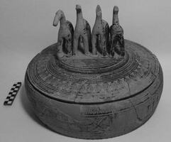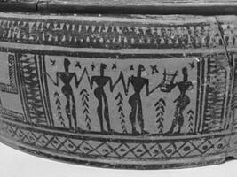 Athens, Anoixi, Kritis St. A. Hatzidimitriou (B’ ΕΠΚΑ) reports on the discovery of a Late Geometric burial of a female. The shaft grave contained jewelry and 32 intact vessels. These include oinochoae (Fig 1), skyphoi, 2 aryballoi (Fig 2), three plates (Fig 3), and five pyxides whose lids are either decorated with terracotta horses (Fig 4) or have handles. One of the pyxides depicts a circle dance (Fig 5). The jewellery includes a gold hair ring, 2 bronze armlets and two silver fibulae. Finally, part of a kiln, a floor, a wall, and a fragment of an unfluted column dating in the Late Classical period were found.