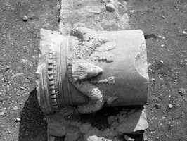 - dans le secteur de Marmaroto, la fouille du terrain Perou-Zoïdi a livré un mur épais (larg. 0,95 m), orienté Nord-Est/Sud-Ouest, dans l’élévation duquel on constate un remploi d’autel circulaire à bucranes (fig. 1). On a également dégagé des sépultures de types variés, datées de l’époque archaïque à l’époque hellénistique ; elles ne comportaient pas de mobilier.