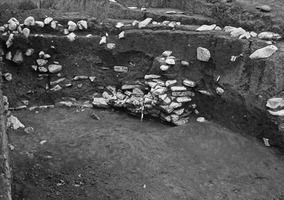 La fouille partielle du tumulus a révélé un segment courbe de mur construit en encorbellement à l’aide de dalles de calcaire (fig. 3) ; des empilages de moellons bruts de calcaire et des couches de gros galets auraient été utilisés respectivement pour étayer cette structure de l’extérieur et pour protéger le tumulus de la corrosion. Ces vestiges suggèrent l’existence d’une tombe à tholos très mal conservée (sa voûte ayant notamment cédé), d’un diamètre intérieur estimé à six mètres et dont l’entrée, précédée d’un dromos, aurait été située vers l’Est/Sud-Est. La faible quantité de céramique recueillie ne permet pas une datation plus précise du monument, mais la grande taille de ce dernier favoriserait plutôt l’hypothèse mycénienne.