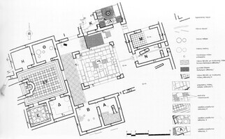 La pièce Nord (M) présente un sol pavé de dalles de terre cuites ornées d’incisions ondulées ou cruciformes. Les murs Est et Ouest ont été renforcés, dans un second état de construction, par la construction d’un deuxième mur en petites pierres et tuiles. Les tessons de céramique à glaçure permettent de dater cet ajout de l’époque tardobyzantine.