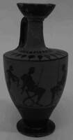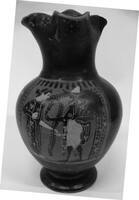 Kifissia, Anoixeos 6 (between Char. Trikoupi and Pyrrou). Athena Hatzidimitriou (B’ ΕΠΚΑ) reports on the discovery of 3 cremations in pointed jars. The first jar contained bones, 2 bronze foils and seven black-figure vessels. The latter include a trefoil-lipped oinochoe showing Hermes offering a flower to a woman (Fig. 1) and a lekythos showing two seated figures with another two, younger men standing next to them (Fig. 2). All the finds date to the early 5th c. B.C.