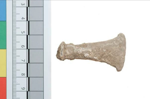 The widespread occurrence of potsherds with traces of copper, indicative probably of local copper working, were supplemented by much more numerous indications in Trench L, on the eastern slope of the island, where a stone dagger mould, metallurgical ceramics and numerous copper fragments, as well as a floor surface with a burnt area revealing extremely high traces of metals after XRF analysis suggested casting procedures were undertaken in that location. Numerous fragments of lead, as well as the find of a small lead axe (Fig. 5), suggested the casting also of lead artefacts. Metalworking has been shown both in the previous excavations and in this year’s campaign to be a frequent component of routine occupation of spaces throughout Dhaskalio, but this year’s find may point to the presence of a workshop in this area. Portable XRF study of Dhaskalio revealed high readings of copper throughout and high readings of lead in the north part of the island, in contrast to much lower readings in Kavos, except on the Kavos promontory, where metalworking is known to have taken place.