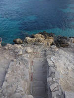At the east edge of the island, at a lower level, and only 5m above the sea, Trench H revealed a stairway and drain which was clearly an entrance to Dhaskalio, perhaps the main entrance from the causeway which in EBA times connected it with Kavos (Fig. 6). The notable stairway in Trench H documents a conspicuous entrance to the settlement and may find a counterpart at a higher level at the southern end of the major terrace wall excavated in 2008 to the south of Trench II, the same wall ending immediately to the north of this year’s Trench L, where it runs into the bedrock. Cleaning operations at the north end of the site have revealed more clearly the complexity of the wall structures in that area. The complex arrangement of walls running at a lower level east-west at the north end of the island was under investigation in Trench C and Trench SB at the end of the excavation season, and it is hoped that a clearer picture will emerge of these notable structures during the 2017 season. Ceramic studies are beginning to offer the impression that, while the summit was fully utilised in Phase C, much of the extensive building remains visible elsewhere on the site are of Phase B date, and, beyond the summit, it may be the case that not many areas were utilised in Phase C. The extent of habitation in Phase A remains to be confirmed.