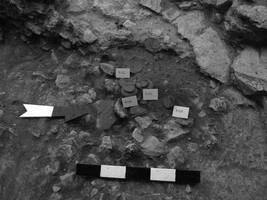 The rectangular building (Fig. 3) consisted of a prothalamos with a well, a central, stone-paved room, and a smaller room that contained another well. The latter room could have been a later addition. A large, carefully-constructed wall ran parallel to the building, and a ritual pyre was found adjacent to this wall (Fig. 4). The pyre contained numerous, 4th c. B.C., miniature vessels (lopades, cook-pots, plates, a pyxis with a lid, a stone alabastron and an unguentarium) and could have been an enkainion associated either with the construction of the wall or with the construction of the aforementioned, smaller, subsequently-added room. Numerous loom weights and coins, two of which were silver, were found in the building. The latter is interpreted as a storeroom for textiles or the place where textiles were woven or a residential building.