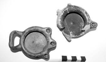 Small finds from the area include coarse ware sherds, plain ware sherds, black-glazed sherds most of which belong to drinking vessels such as skyphoi (Fig. 5), kylikes and kantharoi, few red-figure sherds, lamps (Fig. 6), and a few coins, two of which are Athenian, fourth-century, silver tetradrachms (Fig. 7).