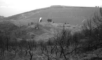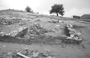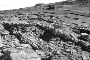 South hill: rubble walls delimiting two roofed spaces were excavated (Fig. 9). In addition, numerous rock-cuttings and cairns were found. Finds from the area include Late Hellenistic bronze coins, Late Hellenistic black-glazed pottery sherds and hundreds of sherds from beehives. It appears that beekeeping was practised in this area from the late Classical until the Early Byzantine periods.
