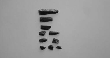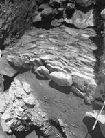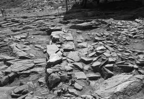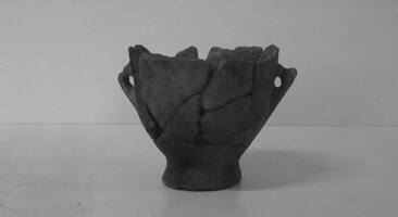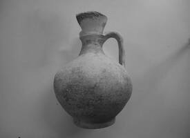 North hill: an extensive circular structure was revealed (Figs. 2, 3), which served as a retaining wall. The structure enclosed a deposit containing pottery (Fig. 4), and numerous burnt bones, and obsidian and flint tools (Fig. 5) were founds within its limits. The pottery from the deposit and the surrounding area date the structure to the Final Neolithic to the Early Bronze Age. In addition, 6 rock-cut graves were excavated on the east side of the structure. The graves had been covered with schist plaques and contained skeletons in an extended position. One of the graves contained a secondary inhumation and Early Helladic pottery. Another one contained a 6th c. A.D. jug (Fig. 6). It is highly likely that the graves were originally cut in the early Helladic period and then reused in Early Byzantine times. During this later period, a farmstead was built on the south side of the aforementioned hill (Figs. 7, 8)