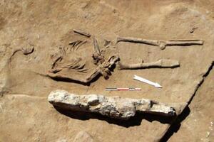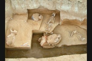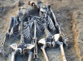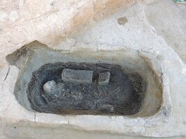 Another important find from the cemetery is a burial in a wooden box. Due to the quality of the sediments in the Phaleric delta, the wood was preserved (Fig. 4). In addition, two couples were found that were buried together holding hands (Fig. 5). Finally, the burial of a woman who died in childbirth was revealed. The head of the infant had come out of her womb whilst the rest of its body remained inside her.