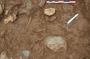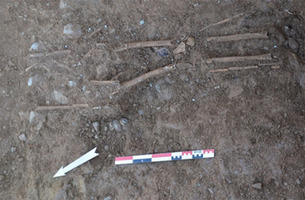Dans le secteur de la nécropole occidentale de la baie de Xanemo, trois sondages ont été ouverts (fig. 1). Ils ont fait connaître deux nouvelles tombes et les restes probables d’une troisième. La tombe IV/2016 a été mise au jour à faible profondeur ; il s’agit d’une inhumation simple d’un individu adulte, déposé dans une fosse (fig. 2). Quelques os et quelques tessons de céramique indiquent probablement la présence d’une autre sépulture, perturbée, située 0,50 m au-dessus (tombe V/2016). Parmi les objets trouvés dans la tombe IV/2016, on compte des tiges de fibules en bronze ou d’épingles, un fragment d’une épingle à tête discoïdale, deux sphécotères en bronze, ainsi que des tessons de céramique (oenochoé, amphorisques, cruche). Dans l’angle Nord-Ouest de la fosse, à un niveau supérieur, on a trouvé, mêlé à des pierres plates en relation avec la tombe III du début du Xe s., une figurine en terre cuite de bovidé et un os long. À quelques mètres au Sud de ces sépultures, on a mis au jour la tombe VI/2016 : il s’agit d’une inhumation dans une fosse orientée Nord-Sud, avec la tête vers le Nord. La tombe était fermée par trois dalles et était signalée par une grande pierre de chant. À côté du crâne, on a trouvé un lécythe à décor de palmettes en figures noires, daté de 490-480 av. J.-C. (fig. 3)