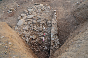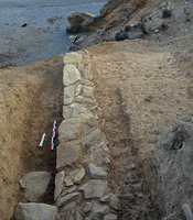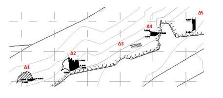 Sur les pentes Nord/Nord-Ouest de l’habitat, on a exploré une structure semi-circulaire (Δ1), de dimensions 3 x 2 m, constituée de moellons et formant vraisemblablement une base pour une superstructure en brique qui n’a pas été conservée (fig. 4-5). Au-dessus de la structure, on a recueilli de nombreux coquillages et quelques tessons. Cette structure s’appuyait sur un mur de terrasse plus ancien d’une longueur de 2,90 m, orienté Nord-Ouest/Sud-Est et construit en blocs de taille avec des insertions de blocs plus petits. Le mobilier suggère une datation de la structure au troisième quart du VIe s. av. J-C. Quelques tessons du VIIe s., recueillis à un niveau inférieur, sont probablement en relation avec le mur de terrasse.