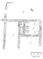 Patras, Roitika, Ch. Maritsi Street (Property of G. Nikolopoulou). Anastasia Koumousi (6th ΕΒΑ) reports on the excavation of a building complex that has partly been identified in an adjacent plot (Fig 1). It served as a storage facility (Fig. 2) for a farmstead of four rooms, two of which are connected by a door. The walls were made of rubble and mortar and had a preserved height and width of 0.85 m. and 0.60 m. respectively. Pottery, reused spolia and 14 bronze coins of the 5th - 6th centuries A.D. were also found.