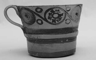 Grave 1 is a cist burial lined with limestone and aligned on a NE-SW axis. The covering tiles were not preserved (Fig 2). The interment was of an adult in a contracted position, with grave goods including a bronze lance and a Vapheio cup decorated with lines and spirals and dated to Late Helladic I (Fig. 3).