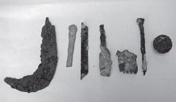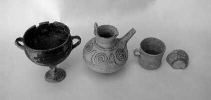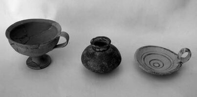 Grave 2 is a chamber tomb aligned on a NE-SW axis, in which part of the dromos was preserved along with an entrance sealed by a rubble wall (Fig. 4). The upper part of the chamber had collapsed. While the shape of the chamber was initially roundish, with continuous use its sides had been enlarged. Within the chamber was a destruction layer and the remains of a hearth as well as roof tiles, domestic pottery (Figs. 5, 7) and large numbers of metal objects (Fig. 6). Later modifications to the interior were also noted. According to the excavator, the finds were of a simple domestic nature. Based on the pottery, these have been attributed to the end of the 18th to the beginning of the 19th centuries AD. Part of the original content of the chamber included three disturbed pits containing a few skeletal remains as well as pottery of Late Helladic IIIA.