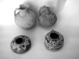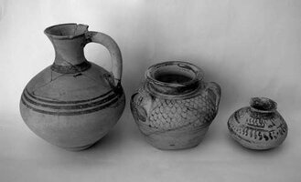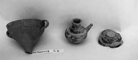 Chamber tomb 7 was irregular and only partially preserved, containing at least three burials dated to Late Helladic IIIA. It was richly furnished with pottery including an amphora with a high neck, rounded and cylindrical alabastra, a jug with a cutaway neck, a kylix with a high neck, a feeding bottle and others types (Figs. 12, 13, 14). Additional finds included a phi-type figurine, stone beads and bronze objects.