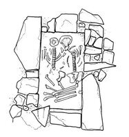 Cist grave 8 was built with limestone and covering slabs (Fig. 15). It contained the remains of a possible adult female and a child, lying face to face. Small bronze tongs were found next to the adult and the grave was dated to the Early Mycenaean.