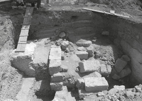 À une profondeur de 2,10 m, dans le cadre d’un sondage de 8 x 8 m (sondage 1 ; fig. 1), ont été dégagées les fondations du mur de rempart, orienté Nord-est / Sud-Ouest ; un autre tronçon de ce mur avait été mis en lumière par des fouilles italiennes 125 m au Nord-Est. Au Sud et à l’Ouest du tronçon conservé, une couche de destruction contenait aussi bien de la céramique classique, en provenance de tombes à proximité, que de la céramique hellénistique, qui correspond à la phase de construction du mur. La fouille a mis en lumière le lit rocheux de pose des fondations du mur, au dessus duquel les couches de préparation destinées à drainer les eaux de pluie sont constituées par un remblai sableux mélangé à des galets avec, au dessus, une couche de gravats. Les fondations du mur de rempart étaient constituées de cinq assises de blocs, en appareil isodome, jusqu’à 4,80 m d’épaisseur. Dans le cadre d’un sondage profond, dans une tranchée allongée creusée dans le rocher et perpendiculaire au mur, a été retrouvé un dépôt de fondation, contenant une monnaie rhodienne en bronze de la seconde moitié du IVe s. av. J.-C. (N3331), une amphore fragmentaire proto-rhodienne de la fin du IVe - début du IIIe s. av. J.-C. avec anses timbrées (A23099), ainsi que d’autres fragments céramiques. Dans l’angle Nord-Est du sondage ont été retrouvées, à une profondeur de 1,35 à 2,3 m, des couches appartenant à la rue P40, qui longeait du côté interne le mur de rempart. Quatre sols successifs ont été identifiés, mais leur datation n’a pas été possible en raison du faible nombre de tessons découverts.