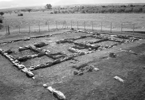À Almyros, sur le site de la ville antique de Halos, R. Reinders, Zoï Malakassioti et V. Rontiri (XIIIe éphorie des antiquités préhistoriques et classiques et Institut hollandais à Athènes) ont poursuivi en 2008 la fouille systématique dans la ville basse hellénistique. Les travaux ont porté sur la fouille partielle d’une maison hellénistique, la « Maison à la baignoire » (fig. 1), qui se trouve sur un champ qui a été exproprié. On a dégagé les fondations de murs qui complètent le plan de l’édifice. Le sol des pièces n’était pas toujours visible, puisqu’il était constitué de la roche naturelle et de pierres. La plupart des murs présentaient un parement externe et un parement interne.