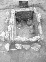 À Lamia, dans le secteur d’Ano Revenia, Néapoli, Ph. Tilitsa et K. Psarogianni (XIVe éphorie des antiquités préhistoriques et classiques) ont mené en 2009 une fouille de sauvetage sur le terrain Sakellari, situé rue Armenopoulou, et a mis au jour une tombe à ciste de l’époque protogéométrique (dim. 1,02 x 0,74 x 0,76 m ; fig. 1). Elle comportait les os d’un individu déposé en position fléchie et tourné vers le Sud, la tête à l’Ouest. Le défunt était accompagné d’oenochoés à bec trilobé, d’un gobelet, d’un skyphos à pied, d’un alabastre, de deux amphores Lederware ou Burnished Ware, d’une pointe de lance en bronze, de fragments d’une épée en fer de type Naue II, de fragments d’une petite épée dans son étui recouvert de cuivre, de fragments d’un couteau en fer, d’un aiguisoir en pierre avec un orifice.