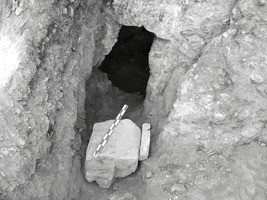 Dans le secteur III, on a fouillé neuf tombes, dont l’une était une tombe à ciste et les autres, des tombes à chambre taillée dans la roche précédées d’un dromos. Les sépultures avaient toutes été pillées ou fouillées de manière systématique dans le passé, exceptée la tombe 19/2010, explorée cette année (fig. 2). Son entrée était scellée par des dalles et des moellons. L’intérieur renfermait un squelette en mauvais état de conservation, à cause de l’effondrement de la roche des parois et du plafond de la chambre. À côté du crane se trouvaient deux petites amphores à vernis noir, l’une à décor imprimé et, près de l’entrée, une pyxide, un modèle de lampe et un fragment de figurine. La tombe a été datée au milieu du IVe s. av. J.-C.
