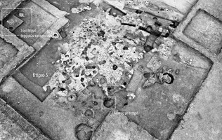 À l’extérieur de la maison, la fouille avait mis en évidence des aires ouvertes. Les structures et le mobilier présents dans ces aires indique qu’une grande partie des activités domestiques, notamment la préparation et la cuisson des aliments, se déroulait dans ces espaces. Ils sont par ailleurs communs à plusieurs bâtiments. L’espace au Nord de la maison était lié à la préparation des aliments, tandis que l’espace à l’Ouest du bâtiment était davantage voué à leur stockage.