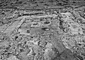 La maison A, occupe une surface estimée à 475 m2 (fig. 2). Elle dispose d’une cour à l’Ouest, au centre de laquelle se trouvent une fosse dépotoir (diam. 1,35 m ; prof. 0,68 m) et un autel (dim. 2,10 x 1,80 m). Au Nord-Est, la cour est longée par un couloir d’un niveau plus élevé, donnant accès à un étage. À l’Est, on dénombre trois pièces. La dernière conservait une structure elliptique ainsi qu’une thékè formée de dalles placées de chant et servant au stockage de graines et d’aliments. Il est à noter qu’on a retrouvé dans la maison des blocs de marbre, dont une base de colonne ionique et des fragments de tambours cannelés. On a recueilli un grand nombre de tuiles timbrées, portant le nom du roi Derda (première moitié du IVe s. av. J.-C.). Au Sud-Ouest de la maison, on a mis au jour un espace comportant de la céramique façonnée à la main, datée de l’âge du Bronze, ainsi qu’un grand trou de poteau et deux figurines animales.
