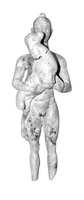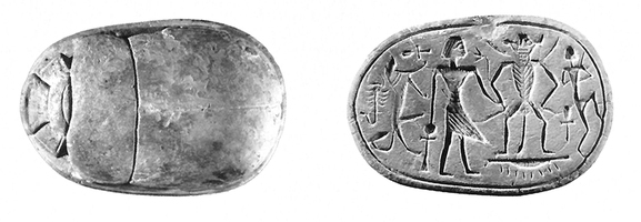 The most significant find [from elsewhere on the site] was a cube-shaped altar (0.31m x 0.33m x 0.44m) of soft limestone with a carved rectangular hollow on a large surface and a second arch-shaped on a small surface. Above the altar were found 2 horns of consecration, also of limestone, and a horse-figurine, while around it were found 6 clay bull-figurines along with fragments. An ivory male figurine was found, holding a calf (Fig. 1), as well as an Egyptian scarab seal of Amenhotep III (Fig. 2). The figurines are dated to the Late Helladic IIIA2 period, while an undecorated kyathos found together with them is also dated to LH IIIA2.