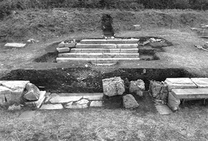 Thermos. I. Papapostolou (ASA) reports on continued excavation in 2016 and 2017 of the 2 monumental staircases behind the E stoa of the Sanctuary of Apollo. The staircases were approached through 2 monumental gateways opening from the back wall of the stoa. The N gateway (width 4.40m) had 2 poros piers, of which the lower part was preserved, while the much wider (7.00m) S gateway also had poros piers, but its lintel was also supported by 2 pillars because of its width. The space between the gateway (neither of which had door leaves) and the staircases was paved. The recent uncovering of the SE retaining-wall of the agora (investigated by G. Sotiriadis in 1901-1902) explains the orientation of the S staircase, which led to the terrace supported by the retaining-wall. A first determination suggests that the staircases went out of use in the mid-2nd c. BC at the same time that the buildings of the agora were destroyed.