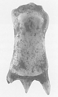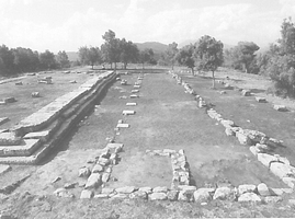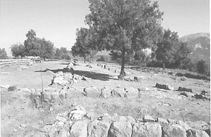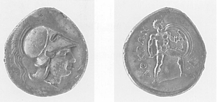 Molykreio. N. Kaltsas and A. Moustaka (ASA) report on further excavation of the Sanctuary of Poseidon and Athena (Fig. 1). Excavation of the stoa was completed to its foundations and it was confirmed that the E wing, with its 11 surviving bases, was the first to be constructed. There followed construction of the W aisle, its façade bearing 11 wooden columns standing on rectangular stone bases, some of which had a depression to house the column (Fig. 2). The size of the great altar was determined and stones from its construction found, as well as coins of the Aitolians, of Pharsalos, of the Opuntian Lokrians (Fig. 3), Classical and Hellenistic potsherds, an Archaic akroterion, a clay doll and figurines (Fig. 4).