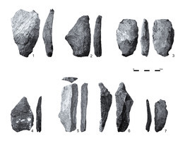 À l’Est du village de Polypetro dans la région de Kilkis, A. Darlas (Éphorie de paléoanthropologie et de spéléologie de Grèce du Nord) a mené en 2009, dans le cadre d’une recherche sur le Paléolithique dans la vallée de l’Axios, une prospection pédestre qui a révélé une occupation au Paléolithique Moyen, d’après la découverte d’objets lithiques provenant probablement d’un atelier de taille. On a en effet recueilli des éclats, des noyaux et des lames qui témoignent de tous les états de la fabrication des outils de pierre taillée, notamment selon la technique Levallois. On a pu reconnaître trois grattoirs et un outil biface datés du Paléolithique Moyen (fig. 1).