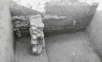On a dégagé un angle de murs (fig. 1) issus de deux phases de construction dont la première se situerait dans le dernier quart du IVe s. av. J.-C., avec une destruction au début du IIe s. av. J.-C. À l’Ouest on a mis partiellement au jour un dépôt de tessons, de tuiles et de moellons : il a livré notamment une partie de lampe de la fin du IVe s. ou du début du IIIe s. av. J.-C. et quatre poids de métier à tisser.