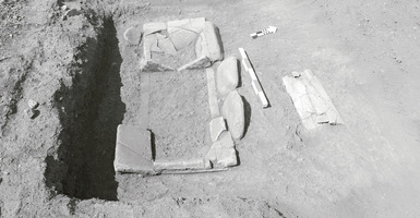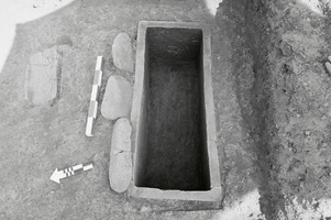 On a découvert un larnax en argile recouvert de trois tuiles qui a pu appartenir à un enfant, à côté d’une petite tombe à tuiles, probablement de périnatal (fig. 1,2). Des restes humains n’y ont pas été retrouvés ; on a juste pu recueillir, dans le larnax, un lécythe globulaire à vernis noir qui date les deux sépultures, vraisemblablement contemporaines, à la fin du IVe ou à la première moitié du IIIe s. av. J.-C.
