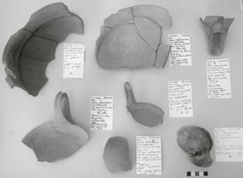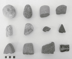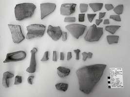 L’habitat apparaît étendu mais de faible densité ; on en a repéré plusieurs fosses correspondant à des habitations, des silos, des aires de travail ou des dépotoirs. Le matériel recueilli (fig. 1-4) comporte des outils de pierre et de la céramique correspondant vraisemblablement à une phase unique d’occupation, durant l’HM II.