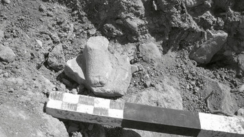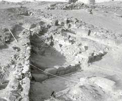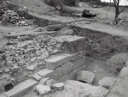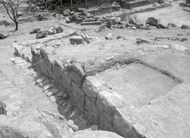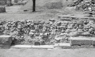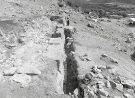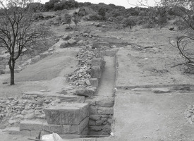 Dans les parties Nord et Sud du koilon, on a mis au jour des rangées de gradins et des sièges isolés (fig. 1) ; dans la partie Nord on a dégagé une structure rectangulaire construite en blocs et moellons bruts et comportant un seuil en remploi dans le mur Sud (fig. 2), ainsi que le périmètre du koilon Nord (fig. 3). Les parodoi Nord et Sud et des escaliers d’accès vers la scène ont aussi été en partie dégagées (fig. 4 à 6) ; dans le premier, notamment, on a repéré une réparation ou reconstruction d’époque romaine, à l’aide de blocs récupérés dans rempart de la cité antique. En général, on a constaté le glissement ou l’effondrement d’un nombre important de gradins et de sièges, en raison de la pente du sol et de la désagrégation du soubassement. Enfin, l’étude d’un mur polygonal construit vers l’Ouest, dans les hauteurs au dos du théâtre, a démontré qu’il s’agit d’un mur de soutènement, contemporain à la structure rectangulaire décrite plus haut (fig. 7,8).