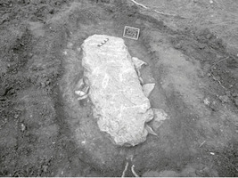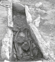 Il s’agit de deux tombes à ciste recouvertes de dalles de schiste et dont le sol était tapissé de fragments de schiste. L’une (fig. 1) contenait une inhumation double accompagnée d’une marmite, tandis que l’autre (fig. 2) renfermait une inhumation simple avec deux epistomia en or, une double fibule, ainsi qu'un autre objet rond en fer, une coupe à bandes et une marmite à deux anses.