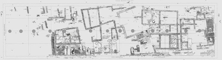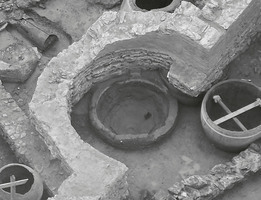 On a découvert un complexe architectural d’au moins quinze pièces (dont huit constituaient son noyau original), parmi lesquelles on a identifié des entrepôts à pithoi et des ateliers. Utilisé en continu durant les IIIe et IVe s., son entrée se situait du côté Sud et donnait sur la route rurale qui menait à la Porte Dorée de la ville. Les murs étaient maçonnés de moellons en pierre et de mortier riche en sable et cailloux et étaient revêtus, du côté intérieur, d’enduit blanchâtre. Les sols des pièces étaient pavés de briques ; on y a retrouvé in situ 31 pithoi, à moitié enfoncés dans le sol. Deux des pithoi étaient enduits à l’intérieur de mortier hydraulique et trois autres de goudron : ils étaient destinés au stockage d’eau et de vin, respectivement. Ces espaces de stockage étaient équipés d’un réseau de cinq conduits maçonnés et quatre puisards. Après une période d’abandon, le complexe a été réoccupé à la fin du IVe s. avec l’addition de nouveaux espaces, le morcellement des anciens (fig. 2) et la destruction de la quasi-totalité des pithoi.