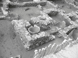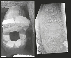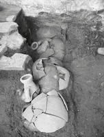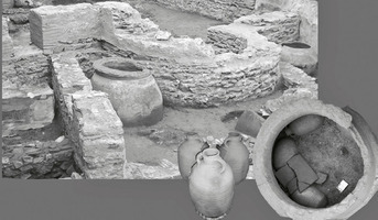 Au dessus des vestiges de ce complexe une église à plan carré (fig. 3 ; cf. Chronique n. 2705) a été édifié dans la deuxième moitié du Ve s. Les murs, en opus mixtum étaient recouverts, à l’intérieur, de deux couches d’enduit ainsi que de fresques, comme le témoigne la découverte, par endroits, d’enduits polychromes. Deux entrées ont été repérées, l’une du côté Sud et l’autre, plus étroite, du côté Est, au Sud de l’abside. Cette dernière donnait sur un espace à moitié couvert qui abritait six pithoi ; l'un d'eux a été retrouvé intact in situ et contenait cinq amphores samiennes entières de la fin du Ve ou du début du VIe s. de notre ère (fig. 4). La porte Sud donnait sur une dépendance/un annexe de plan carré, contemporaine à la nef de l'église (fig. 5). Le sol de celle-ci a été pavé plus tardivement, sous Justin I (518-527), de plaques de marbre de remploi sur un double substrat de mortier hydraulique et tessons. Sous ce sol on a découvert une tombe à voûte datée également du Ve s (fig. 6). Cette dernière était dotée d’une entrée en demi-cercle, sa voûte était construite de briques, ses murs étaient recouverts d’enduit et le sol était pavé de briques. Elle contenait les restes de quatre individus, peut-être en inhumation secondaire. La tombe était associée à une petite boîte assemblée en marbre et à une structure maçonnée orthogonale avec deux amphores intactes. Après l’abandon de l’église, au début du VIIe s., des tombes en fosse ont été creusées dans ses ruines. Située dans le large domaine de la nécropole Ouest de la ville, la fouille a également livré plusieurs tombes à tuiles, surtout des sépultures d’enfants et de nourrissons datées entre le Ve et le VIe s. de notre ère, ainsi que deux tombes à ciste, deux enchytrismes et une tombe en fosse recouverte d’amphores protobyzantines (fig. 7), difficiles à dater.