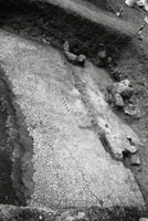 Dans la partie Est du terrain, qui correspond à un îlot de la ville antique, on a dégagé des parties de pièces, dont vraisemblablement un andrôn – équipé d’une bande de sol surélevée le long des murs latéraux – et un espace extérieur, de sol revêtu de galets fendus et mortier hydraulique (fig. 1). Lors du premier sondage, en 2008, on avait également découvert un puits, qui avait livré une partie de statue féminine en marbre.
