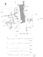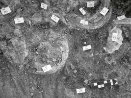 Large d’environ 3 m, la rue pavée déjà mise en évidence lors des campagnes précédentes a été dégagée sur une longueur totale de 12 m. Le complexe architectural qui se trouve à l’Ouest de celle-ci était doté de pièces d’ateliers et d’un entrepôt, qui ont livré des couches étendues de destruction. On a également dégagé dans sa totalité l’espace oblong, délimité par des murs fragmentaires, dans lequel avait été dégagé un dépot important de défenses de sanglier (fig. 2) ; 190 de celles-ci ont été recueillies au total, accompagnées de centaines de feuilles d’or de pierres semi-précieuses et d’innombrables lamelles, disques, rosettes et rivets en or, en argent, en bronze ou en os.