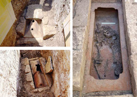 Plusieurs tronçons de murs ont été dégagés à divers endroits de la rue. Au Nord-Ouest du terrain Stakou, sous un pont moderne, on a découvert des détritus d’atelier de céramique antique. Vers l’Est, on a découvert une tombe à ciste d’époque classique, contenant un sarcophage en terre cuite (fig. 1) ; à l’intérieur, le défunt était allongé sur le dos, la tête à l’Ouest, accompagné de quatre skyphoi « bolsal » à vernis noir et d’un alabastre. Une autre tombe à ciste a été repérée directement au Nord et une troisième, d’époque géométrique, vers l’Est ; cette dernière était vraisemblablement une tombe d’enfant et a livré une petite œnochoé à bec tréflé. La présence de ces sépultures indique l’existence, à cet endroit, d’une nécropole.