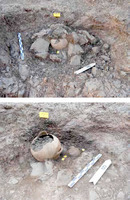 Fig. 1/ La fosse 15 contenant une hydrie (?) cinéraire dans une construction sommaire en moellons, avant (haut) et après (bas) le démantèlement de cette dernière ; on distingue également des vases plus petits, constituant le mobilier funéraire