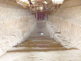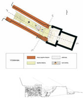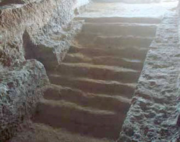On a dégagé le dromos sur toute sa longueur de 15 m. Son sol est constitué de terre argileuse compacte avec des petits cailloux et quelques inclusions de calcaire. Il est accessible, à son extrémité Ouest, par un seuil et un escalier à huit marches, également en terre battue. Une encoche rectangulaire repérée dans la partie haute du mur Sud et vraisemblablement destinée à recevoir une poutre, suggère que le dromos était recouvert d’un toit. Retrouvé près de l’escalier et portant des traces de feu, le dépotoir de la tombe contenait des fragments de plats et de skyphoi, un encensoir, des os d’animaux, des clous et des lames en métal, matériel qui pointe vers une datation de la sépulture entre la fin du IVe et le début du IIIe s. av. J.-C.